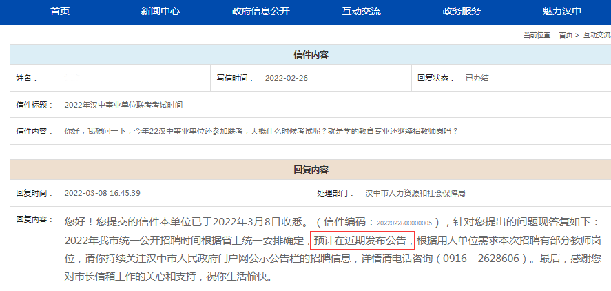 2022陕西事业单位联考公告近期发布!近期有考生在汉中市人民政府咨询2022汉中事业单位考试时间,官方回复:“2022年我市统一 公开招聘时间根据省上统一 安排确定,