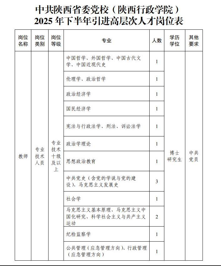 1.资格条件、引进待遇、面试程序等仍按《中共陕西省委党校(陕西行政学院)2025年下半年高层次人才引进公告》执行;